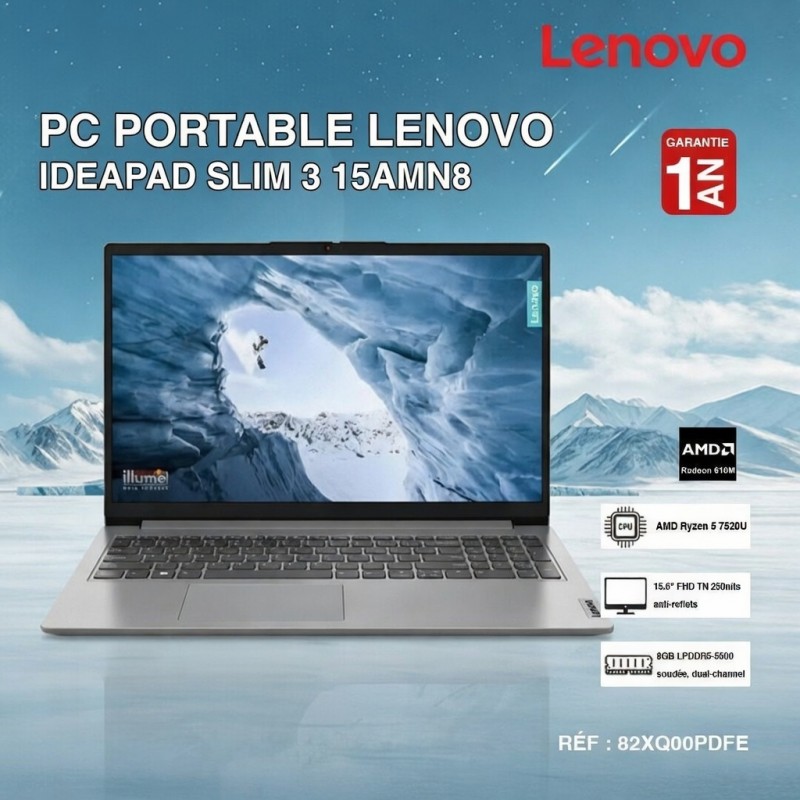 Le PC Portable Lenovo IdeaPad Slim 3 15AMN8 offre puissance et mobilité avec Ryzen 5 et 512Go SSD. Léger et rapide, ce portable Lenovo est idéal pour le travail, l’étude et le multimédia.